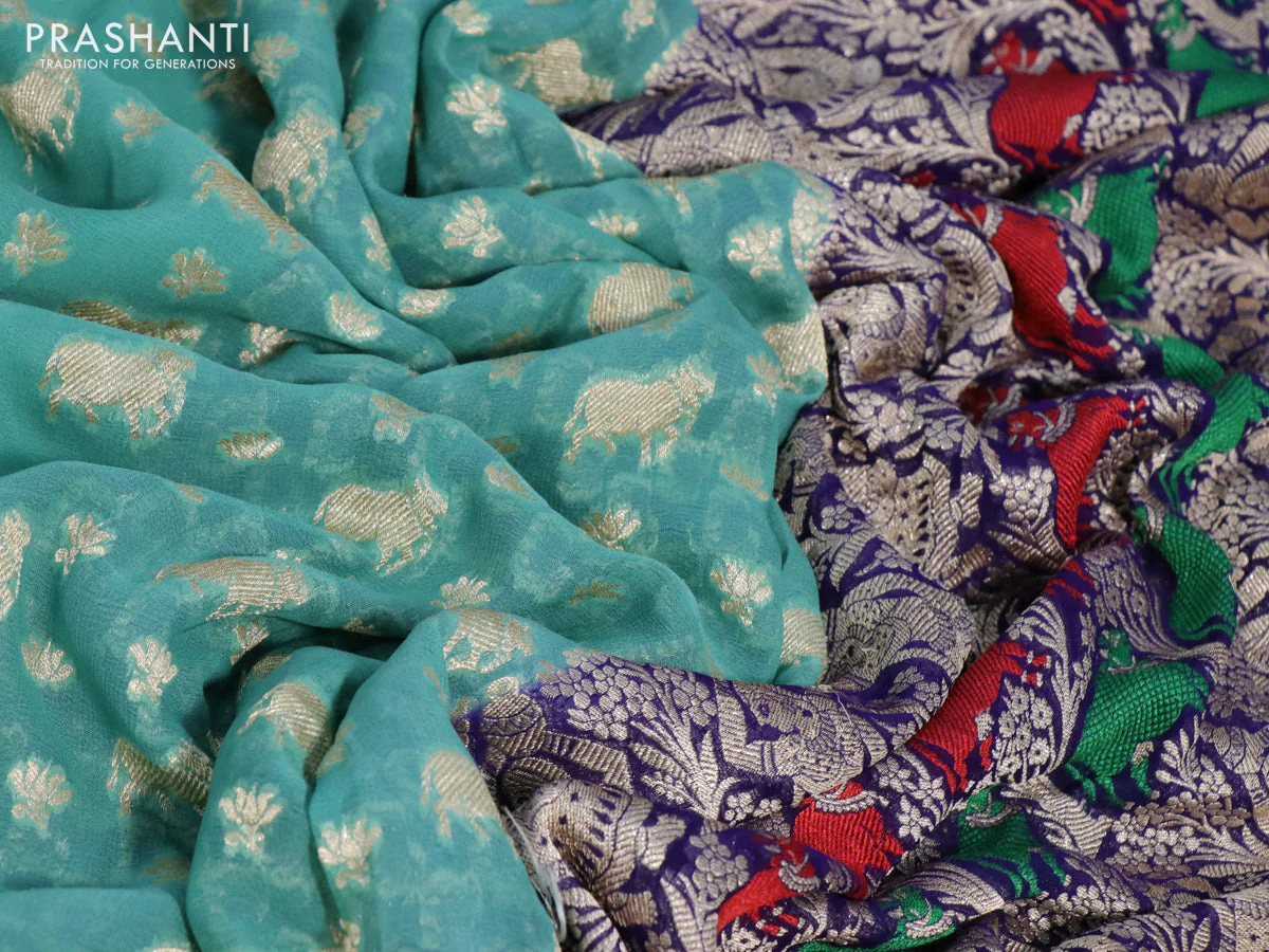 -70%Banarasi georgette silk saree pastel green and blue with allover thread & zari weaves and zari woven border—