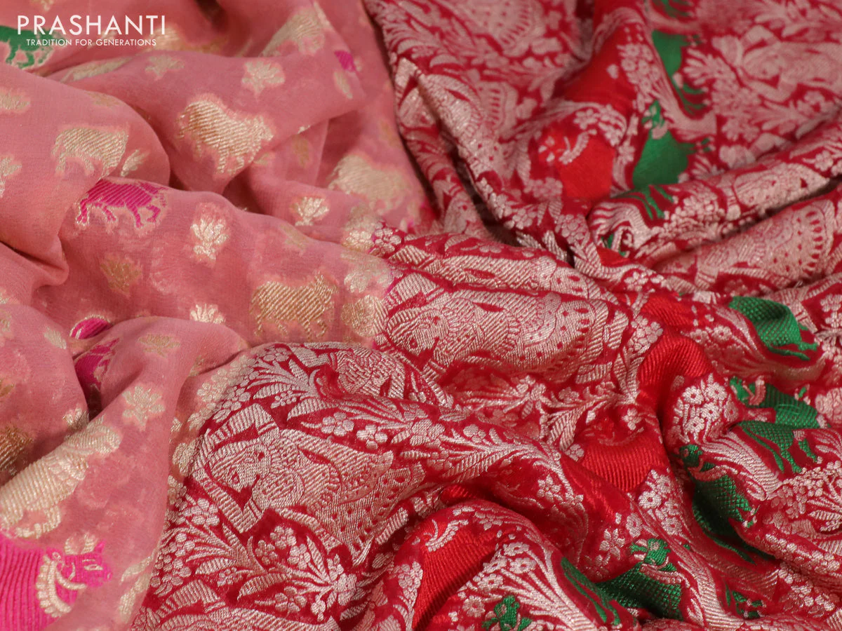 -70%Banarasi georgette silk saree peach pink and red with allover thread & zari weaves and zari woven border—