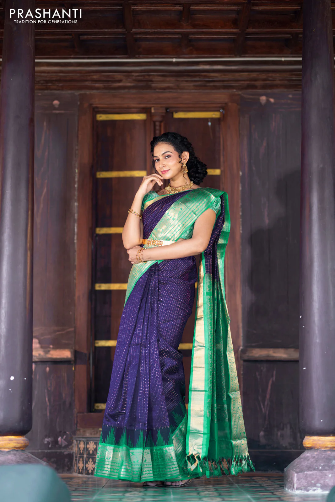 Kuppadam silk cotton saree blue and teal green with allover zari checks & buttas and temple woven elephant design zari border
