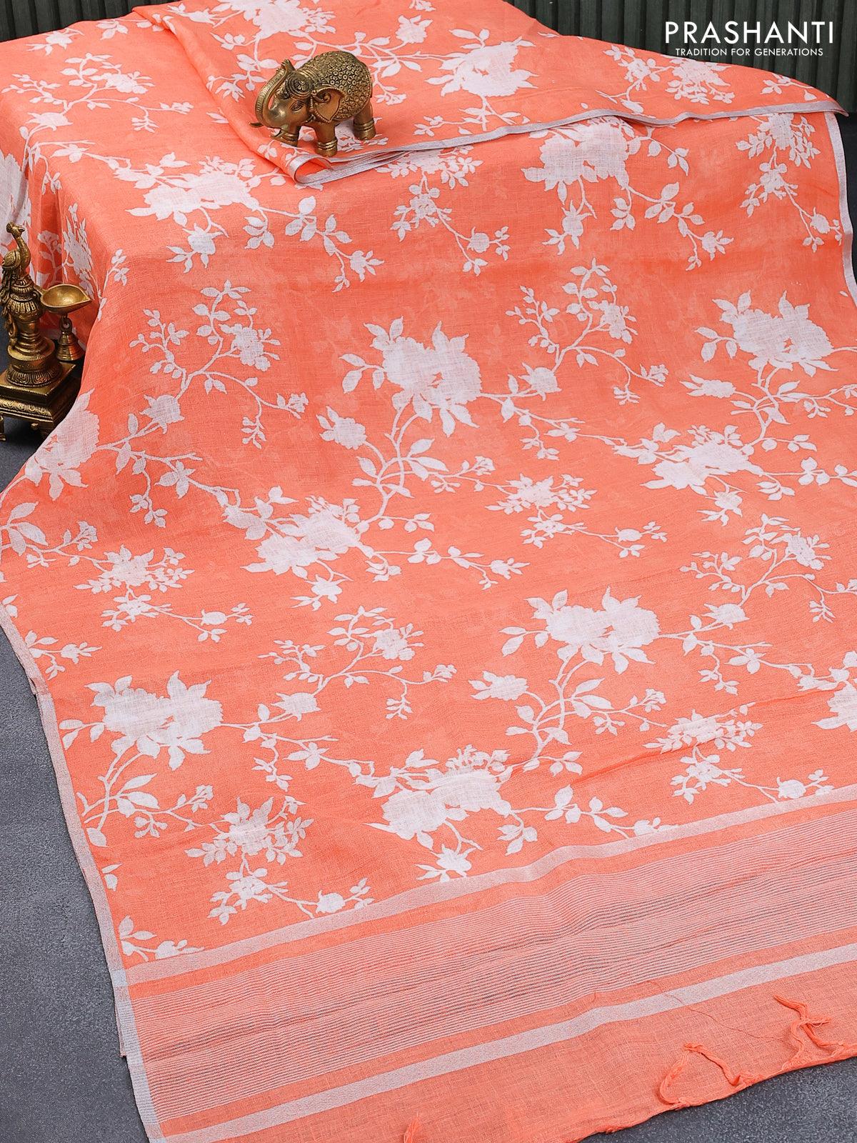 Linen cotton saree peach orange with allover floral prints and small silver zari woven border
