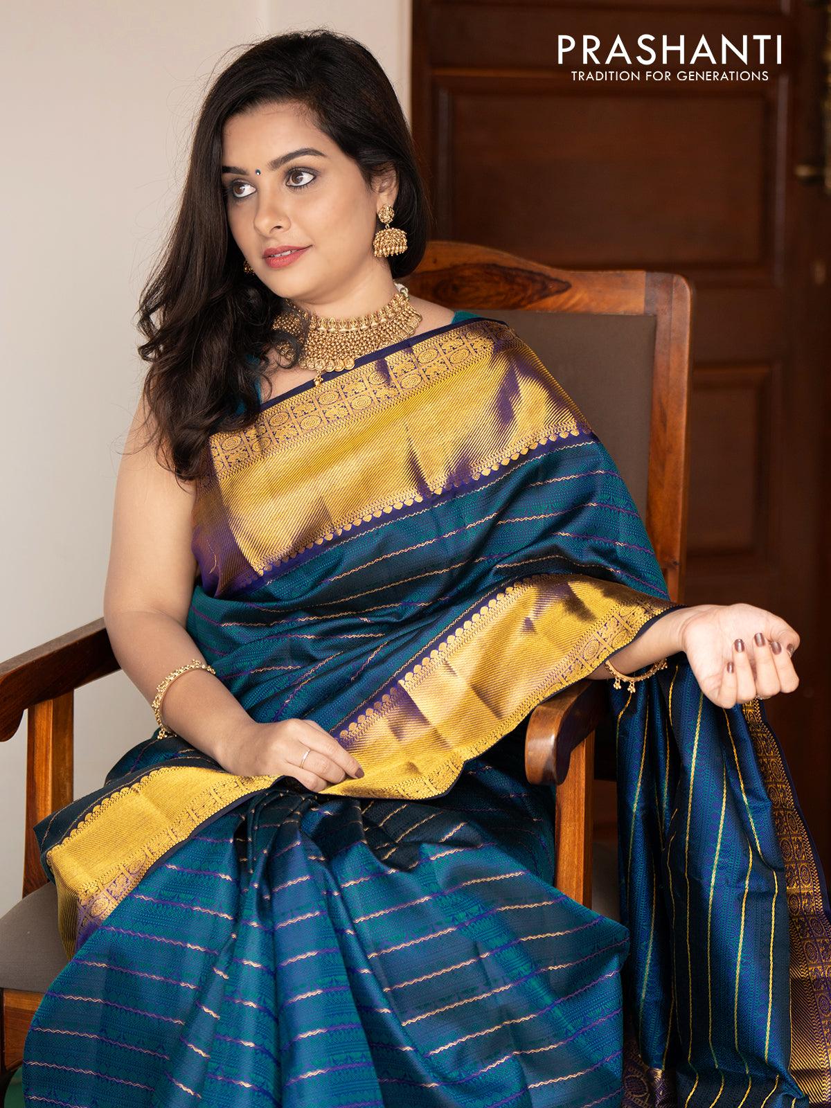 Pa - Pure kanjivaram silk saree deep navy blue and cs blue with lotus and rudhraksha emboss pattern and rich zari woven border - Pre Order