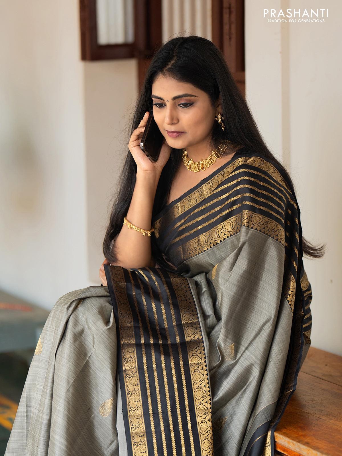 -70%Ma - Pure kanjivaram silk saree grey and black with zari woven buttas and rich paisley & annam zari woven border - Pre OrderU—