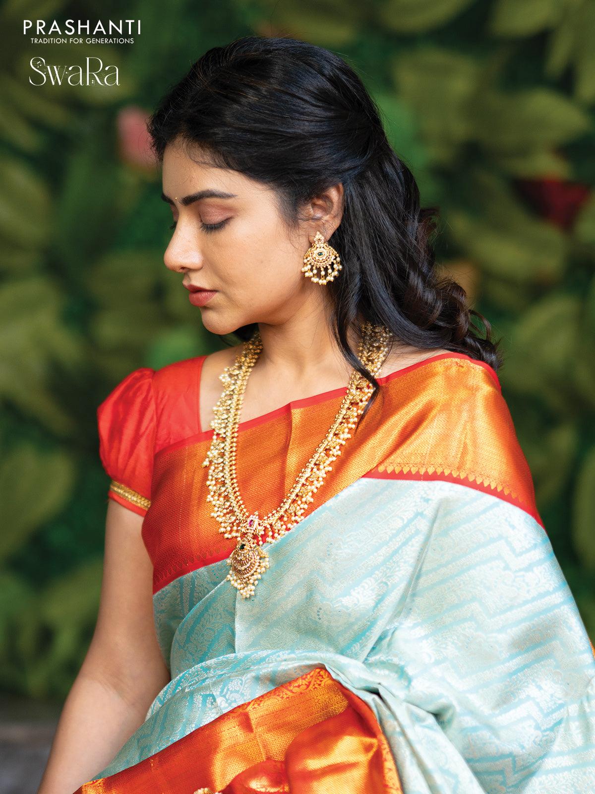Pure kanjivaram silk saree light blue and red with allover silver zari woven brocade weaves and golden zari woven border