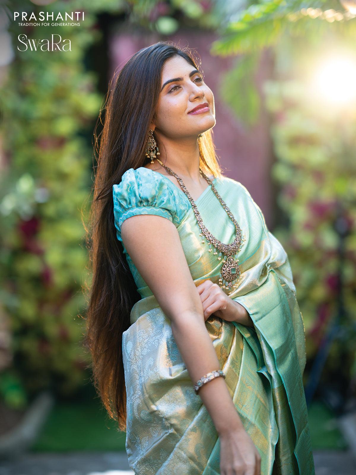 Pure kanjivaram tissue silk saree cream and teal blue with allover zari woven brocade weaves and zari woven border