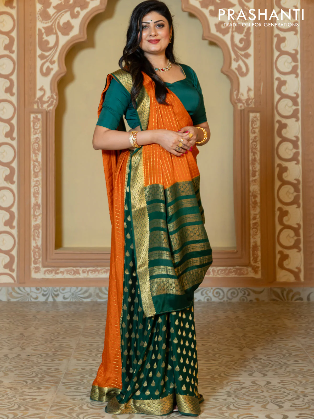 -70%Pure mysore partly silk saree rustic orange and green with allover zari checked pattern and zari woven border—