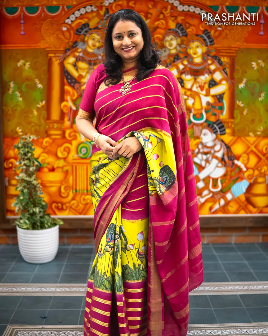 Pure mysore silk saree lime green and magenta pink with allover pichwai prints and long zari woven border