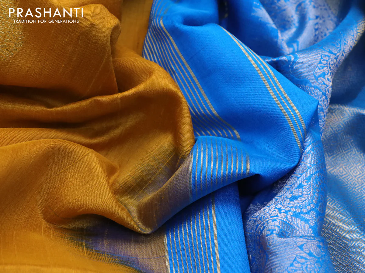 Pure raw silk saree cs blue and mustard yellow with silver & gold zari woven buttas and zari woven border