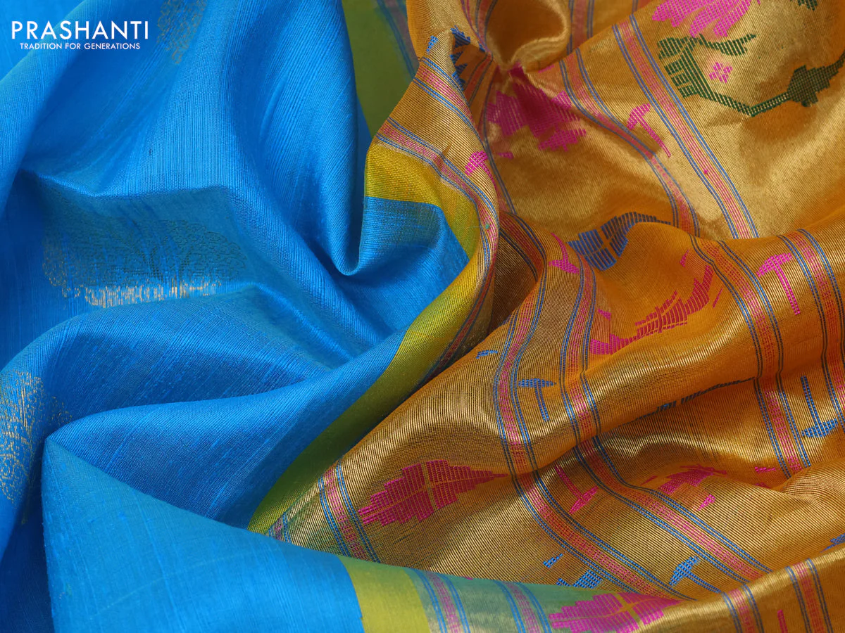 Pure raw silk saree dual shade of cs blue and yellow with silver zari woven buttas and zari woven border